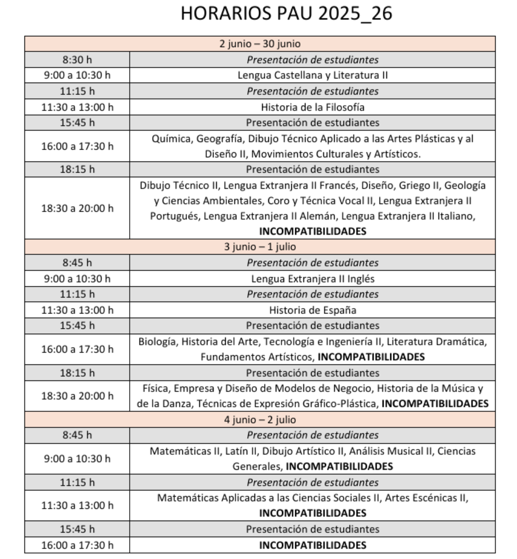 CALENDARIO PRUEBA DE ACCESO 2026: